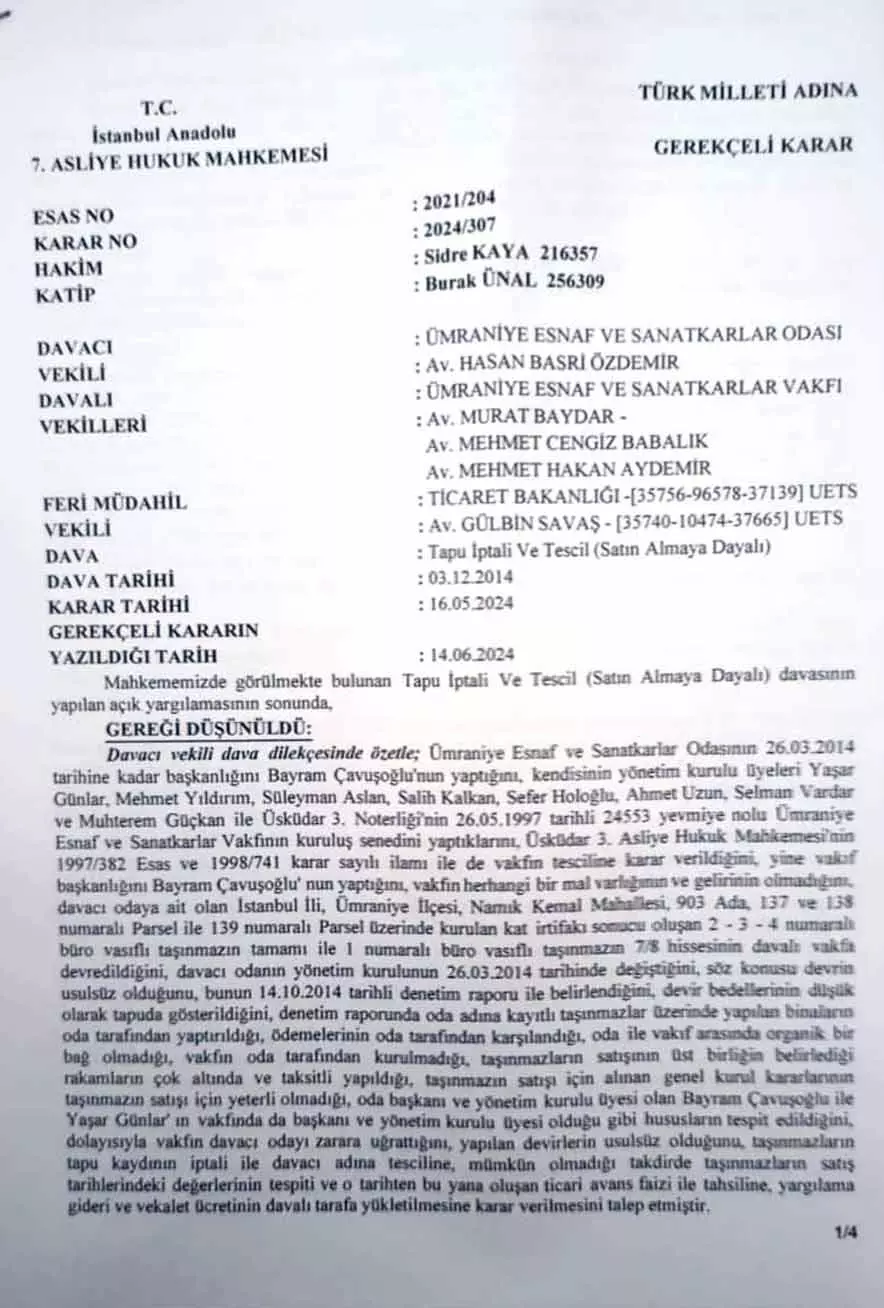 Mahkeme gerekçelerinde; taşınmazların rayiç bedellerinin çok altında devredildiği, bazı satışların yetkisiz ve vadeli şekilde yapıldığı, oda ile vakıf yönetimlerinde yer alan kişilerin aynı kişiler olması nedeniyle iyi niyet şartının oluşmadığı ve temsil yetkisinin kötüye kullanıldığı açıkça vurgulandı.