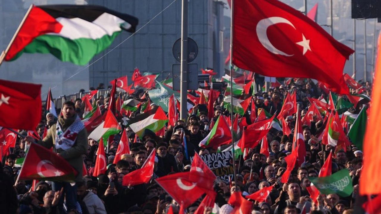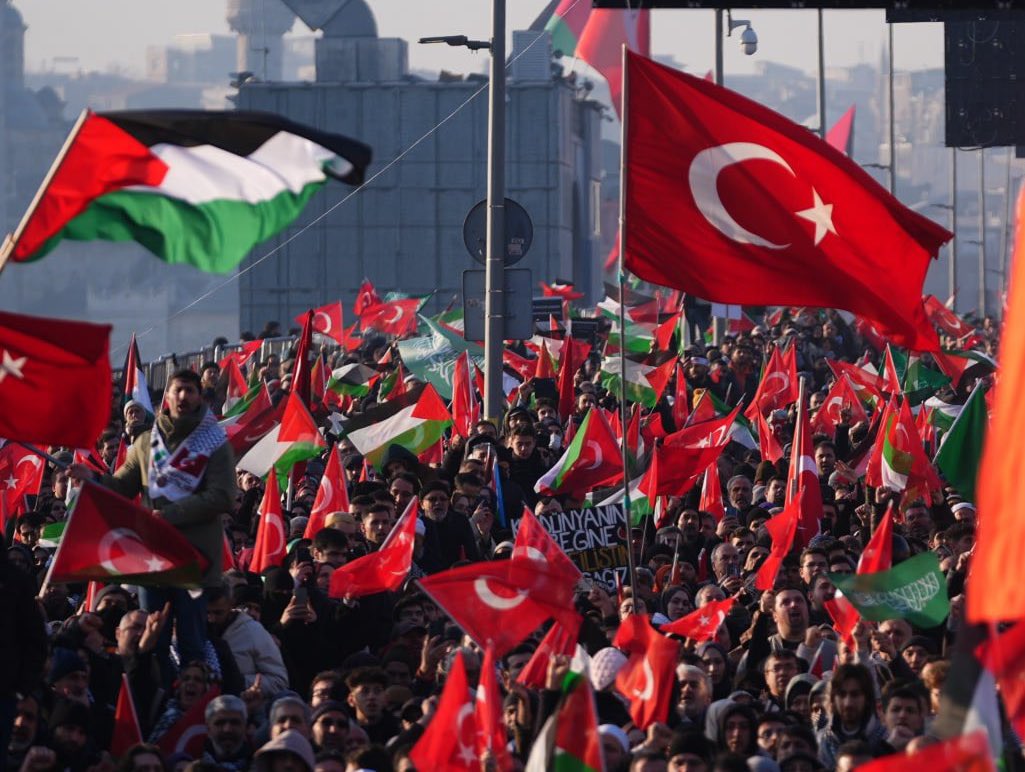 Eylem boyunca katılımcılar İsrail aleyhine sloganlar atarak tekbir getirdi; Türk, Filistin ve Doğu Türkistan bayrakları taşıdı. Galata Kulesi’ne Filistin kefiyesi asılırken, Yeni Cami’nin duvarlarına Filistin direnişine vurgu yapan pankartlar yerleştirildi.